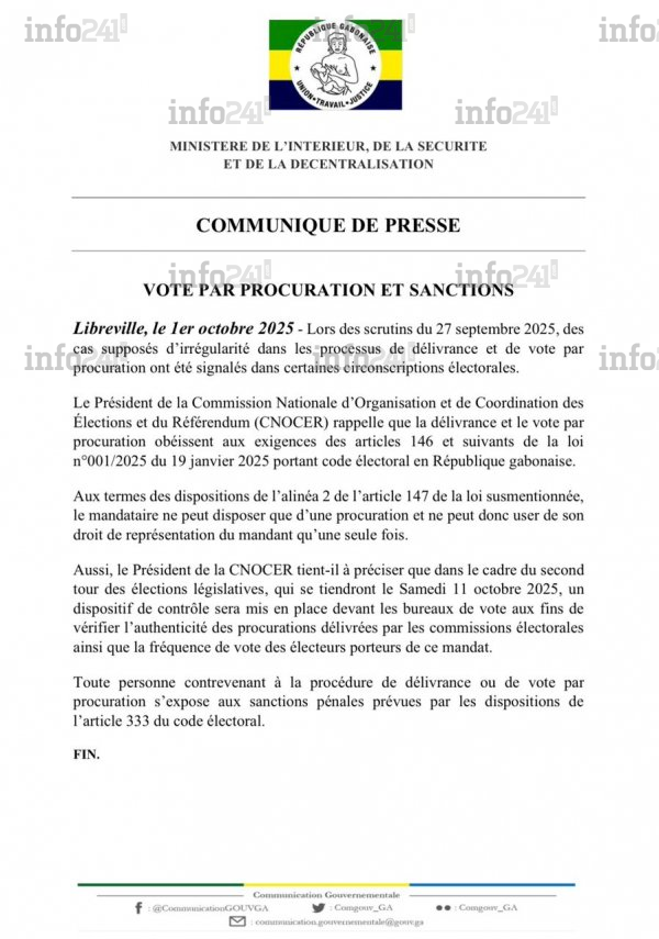 A qui profite le crime ? Le scandale des procurations entache désormais les élections législatives et locales du 27 septembre dernier. Dans un communiqué publié ce mercredi 1er octobre, le président de la Commission nationale d’organisation et de coordination des élections et du référendum (CNOCER), par ailleurs ministre de l’Intérieur, a reconnu l’existence « de cas supposés d’irrégularités » dans plusieurs circonscriptions. Pourtant, aucune annulation ni sanction immédiate n’est prévue pour ce premier tour.