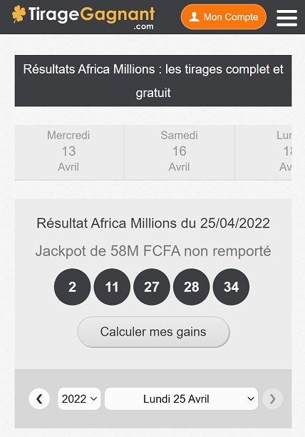 ∙ Résultat officiel de l’AfricaMillions disponible sur Tirage-Gagnant.com (voir un exemple de résultat ci-dessous) et sur le site officiel Africamillions.com.