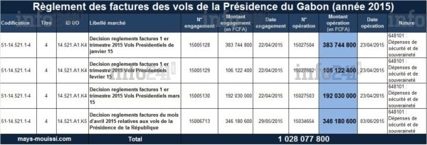 En se basant strictement sur les dépenses budgétaires exécutées en 2015, l’Etat gabonais a pris en charge les vols présidentiels à hauteur de 1.03 milliard FCFA. L’analyse détaillée des règlements effectués permet de constater 4 lignes d’exécutions budgétaires traitée entre le 23 avril et le 3 juin 2015 qui couvrent les vols présidentiels réalisés au 1er quadrimestre 2015. Au-delà du mois d’avril 2015, aucun règlement de factures portant le libellé « Vols Présidentiels » n’a été effectué par l’Etat gabonais.
