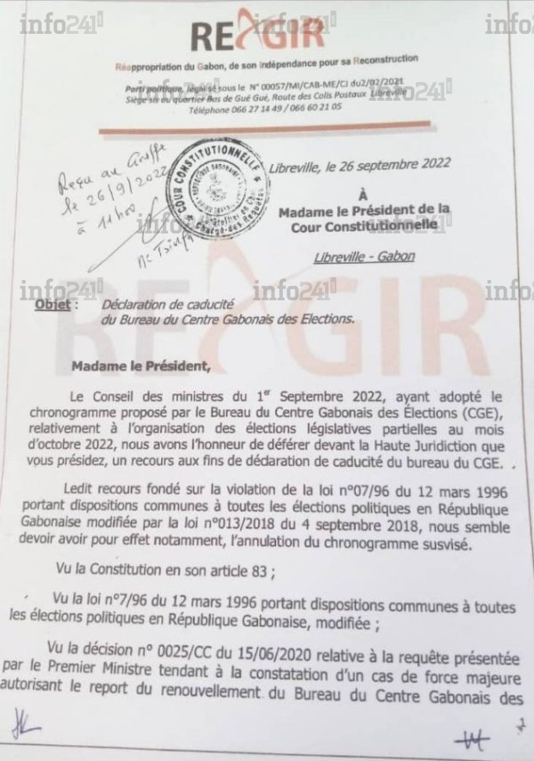 Illégalité du bureau du Centre gabonais des élections : Réagir saisit la cour constitutionnelle © 2022 D.R./Info241