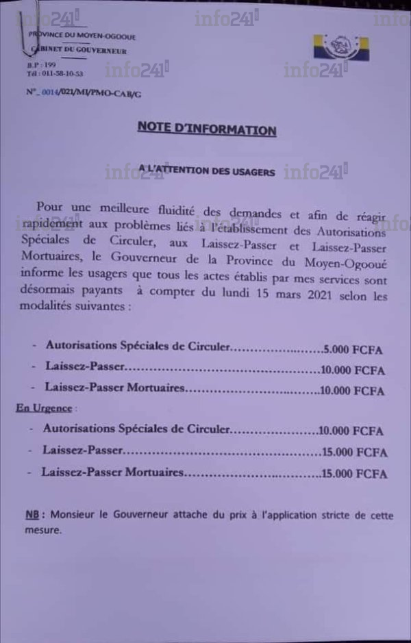 « Faisant suite à la Note d’information N°0014/021/MI/PMO-CAB/G du 11 mars 2021 signée du Gouverneur de la province du Moyen-Ogooué, Le Secrétaire Général du Ministère de l’Intérieur sur instructions du Ministre d’Etat, rappelle à toutes fins utiles qu’en application du principe de gratuité du service public, tous les actes délivrés dans le cadre de la gestion de la crise sanitaire de la Covid-19,autorisant les déplacements à titre exceptionnel des populations, sont gratuits », a fait savoir la secrétaire générale du ministère de tutelle Judith Koumba Pemba Mombo.