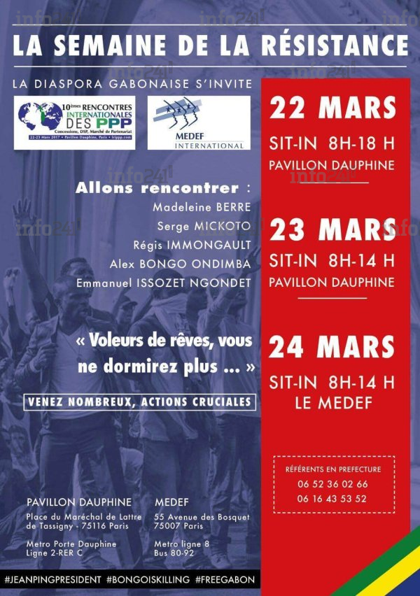 Par ailleurs, à l’occasion des 10èmes ’’Rencontres Internationales des Partenariats Publics Privés’’ (PPP) qui se dérouleront à Paris les 22 et 23 mars 2017, au cours de ce grand rendez-vous annuel dédié aux PPP, réunissant l’ensemble des acteurs publics et privés impliqués dans la mise en œuvre de contrats de partenariat, une manifestation de contestation de la diaspora sera organisée. Car durant ces rencontres expliquent les organisateurs de la semaine de la résistance »des représentants des intérêts du système Bongo-PDG, de la pieuvre holding et Delta Synergie ont été conviés en vue de défendre les opportunités d’investissements en infrastructures au Gabon. Il ne s’agira aucunement des intérêts du Gabon, mais ceux d’une oligarchie d’apparatchiks qui tienne le pays en otage depuis 50 ans. C’est pourquoi Ali Bongo et son régime putschiste refusent le verdict des urnes. "