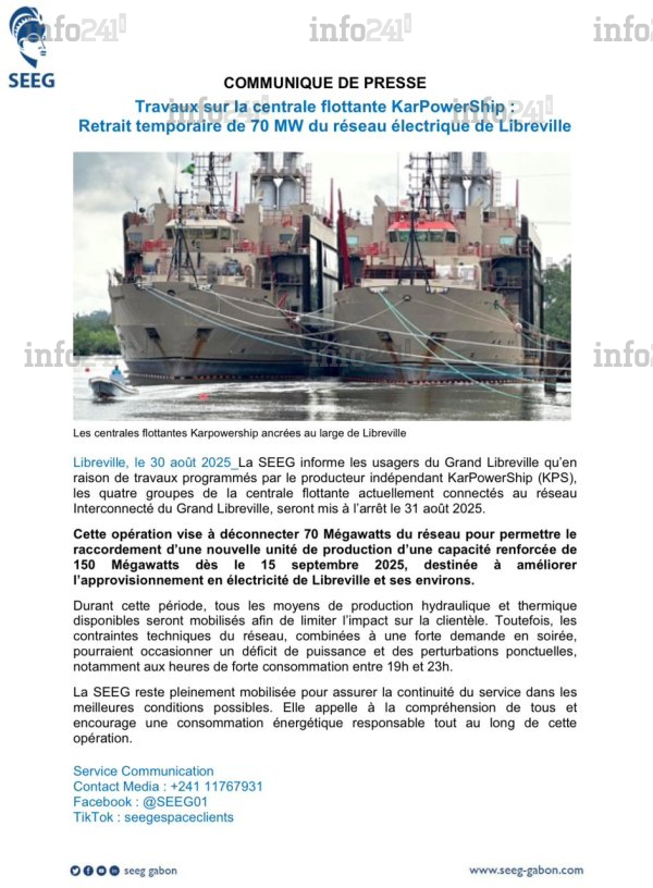 La Société d’énergie et d’eau du Gabon (SEEG) a annoncé ce samedi, dans un communiqué parvenu à la rédaction d’Info241, l’arrêt temporaire des quatre groupes de la centrale flottante KarPowerShip (KPS) ancrée au large de Libreville. L’opération, prévue pour ce 31 août, entraînera le retrait de 70 mégawatts (MW) du Réseau Interconnecté du Grand Libreville.