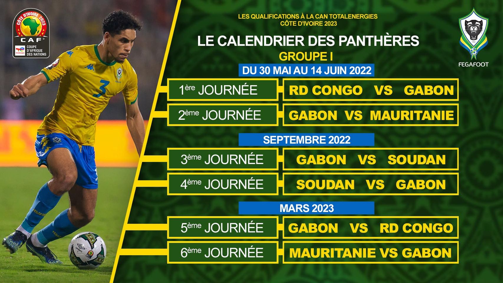 Les 5 et 6 journées fatidiques auront quant à elles lieu l’année prochaine, en mars 2023. Cette fois, le Gabon recevra ses deux adversaires des 2 premières journées. D’abord la RDC sur ses installations en match retour ainsi que la Mauritanie qui recevra en définitive les fauves de l’Ogooué pour cette ultime journée.