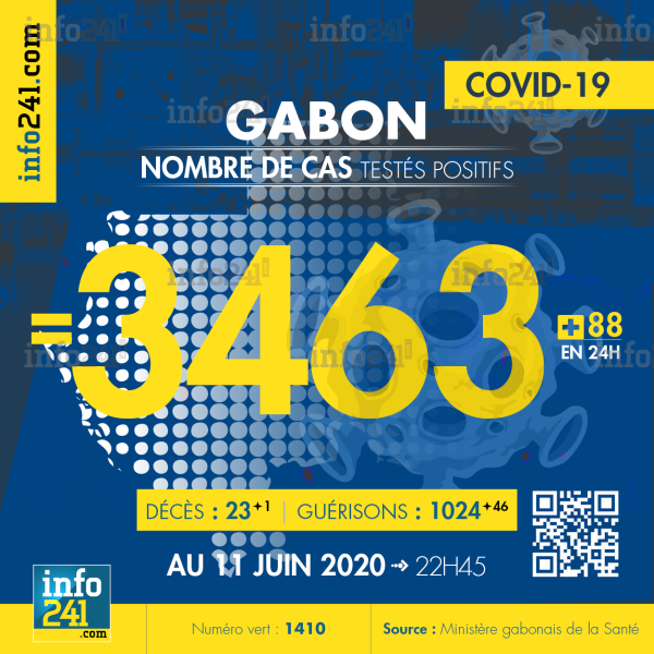 Le bilan de l’épidémie de coronavirus au Gabon au 11 juin : 88 nouveaux cas enregistrés en 24h dans l’Estuaire (64 cas), la Ngounié (10 cas), Woleu-Ntem (7 cas) et le Moyen-Ogooué (7 cas). Il y a eu un nouveau décès à Libreville et 46 nouvelles guérisons. Ce qui porte le bilan à 3 463 cas confirmés, 23 décès et 1 024 guérisons.Il y a actuellement 86(+9) patients hospitalisés dans le pays dont 17 (+0) en réanimation.