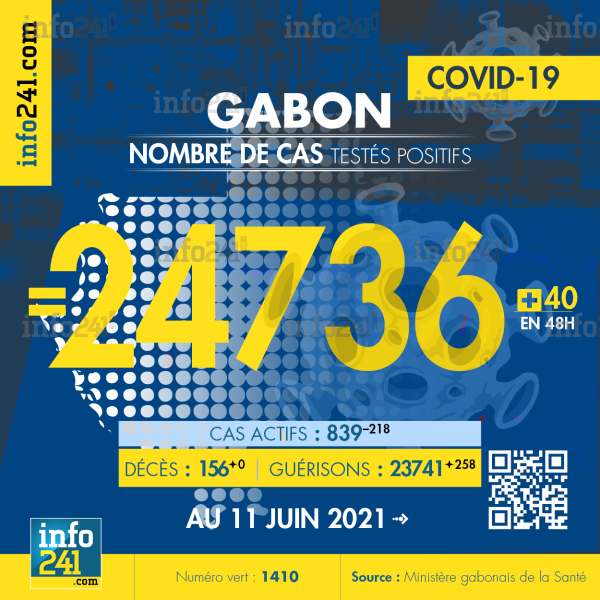 Bilan épidémiologique du Gabon au 11 juin 2021 : 40 nouveaux cas enregistrés en 48h dans l’Estuaire (17 cas), le Haut-Ogooué (10 cas), l’Ogooué-Maritime (10 cas), le Moyen-Ogooué (2 cas) et la Nyanga (1 cas). Il y a eu aucun nouveau décès et 258 nouvelles guérisons.
