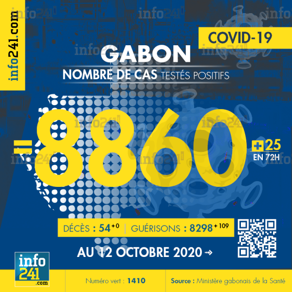 Bilan épidémiologique du Gabon au 12 octobre 2020 : 25 nouveaux cas enregistrés en 72h uniquement dans l’Estuaire. Il y a eu aucun nouveau décès et 109 nouvelles guérisons.