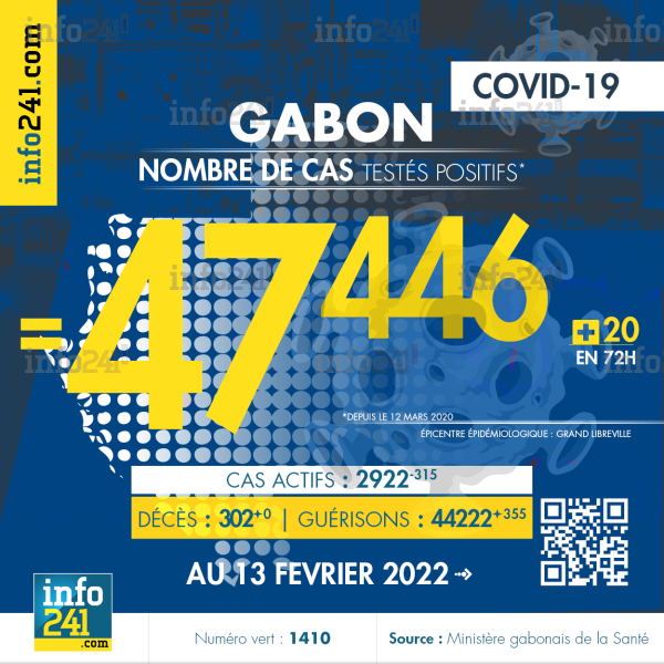 Bilan épidémiologique du Gabon au 13 février 2022 : 20 nouveaux cas enregistrés en 72h dans la Ngounié (10 cas), l’Estuaire (5 cas) et l’Ogooué-Maritime (5 cas). Il y a eu aucun nouveau décès et 355 nouvelles guérisons.