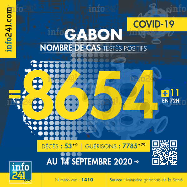 Bilan épidémiologique du Gabon au 14 septembre 2020 : 11 nouveaux cas enregistrés en 72h dans l’Estuaire (8 cas), le Haut-Ogooué (1 cas), le Moyen-Ogooué (1 cas) et l’Ogooué-Lolo (1 cas). Il y a eu aucun nouveau décès et 79 nouvelles guérisons.
