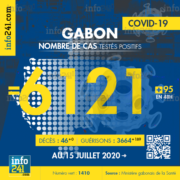 Bilan épidémiologique du Gabon au 15 juillet 2020 : 95 nouveaux cas enregistrés en 48h dans l’Estuaire (39 cas), l’Ogooué-Lolo (28 cas), le Haut-Ogooué (8 cas), l’Ogooué-Maritime (8 cas), la Ngounié (7 cas) et le Moyen-Ogooué (5 cas). Il y a eu aucun nouveau décès et 189 nouvelles guérisons.
