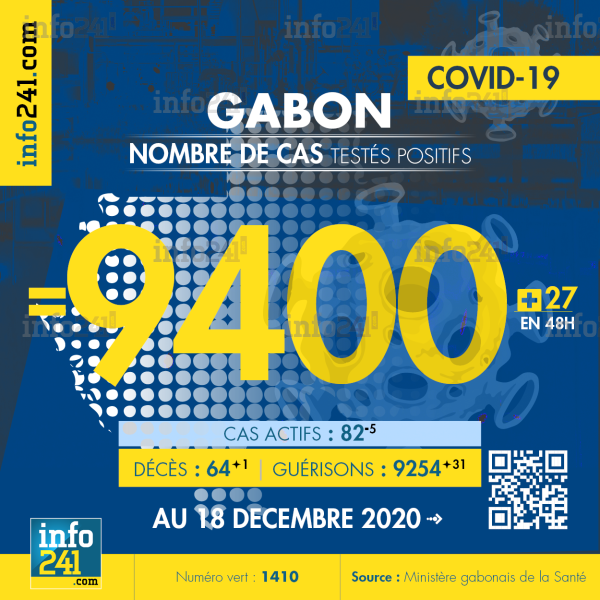 Ce qui porte le bilan à 9 400 cas confirmés, 64 décès et 9 254 guérisons. Le Gabon compte actuellement 82(-5) cas actifs de la pandémie officiellement déclarés. Parmi eux 5(-0) patients hospitalisés dans le pays dont 3(-0) en réanimation.