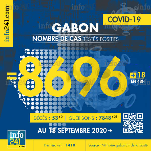 Ce qui porte le bilan à 8 696 cas confirmés, 53 décès et 7 848 guérisons. Le Gabon compte actuellement 795 cas actifs de la pandémie officiellement déclarés. Parmi eux 6(+0) patients hospitalisés dans le pays dont 1(+0) en réanimation.