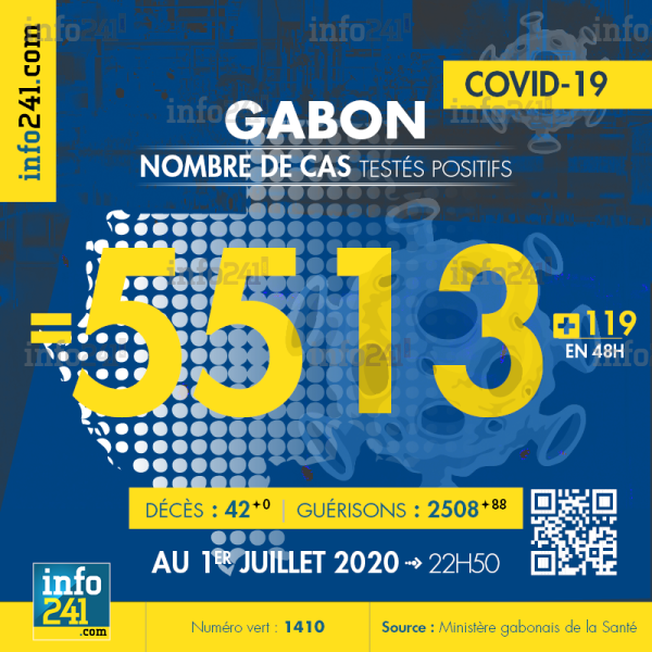 Bilan épidémiologique du Gabon au 1er juillet 2020 : 119 nouveaux cas enregistrés en 48h dans l’Estuaire (46 cas), le Haut-Ogooué, la Ngounié (2 cas) et le Woleu-Ntem (22 cas). Il y a eu aucun nouveau décès et 88 nouvelles guérisons. Ce qui porte le bilan à 5 513 cas confirmés, 42 décès et 2 508 guérisons. Il y a actuellement 2 963 cas actifs. Parmi eux 56(-11) patients hospitalisés dans le pays dont 10(-3) en réanimation.