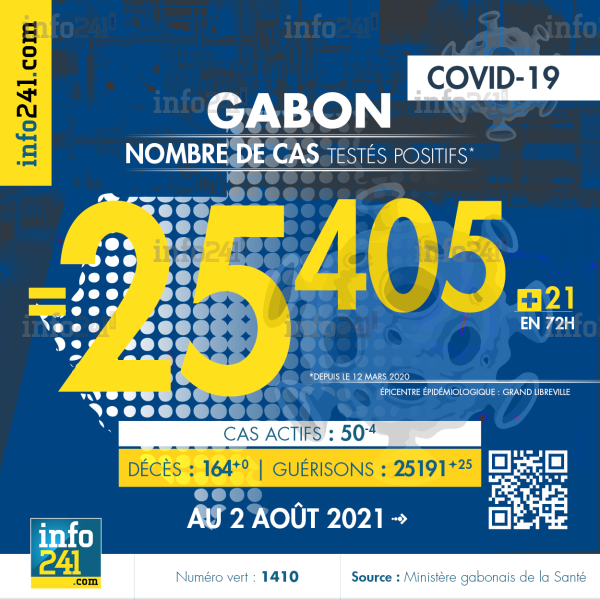Ce qui porte le bilan à 25 405 cas confirmés, 164 décès et 25 191 guérisons. Le Gabon compte actuellement 50 (-4) cas actifs de la pandémie officiellement déclarés. Parmi eux 11 (-0) patients hospitalisés dans le pays dont 8 (+2) en réanimation.
