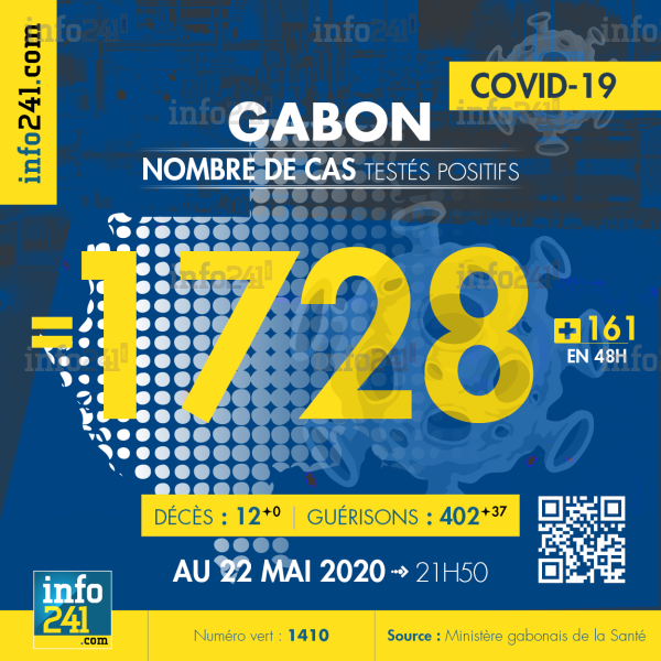 Le bilan de l’épidémie de coronavirus au Gabon au 22 mai : 161 nouveaux cas enregistrés en 48h dans l’Estuaire (158 nouveaux cas) et le Moyen-Ogooué (3 nouveaux cas) . Il n’y a eu aucun nouveau décès et 37 nouvelles guérisons. Ce qui porte le bilan à 1 728 cas confirmés, 12 décès et 402 guérisons. Actuellement 82 patients demeurent hospitalisés dont 9 en réanimation.