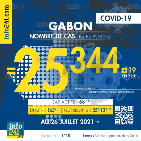 Ce qui porte le bilan à 25 344 cas confirmés, 163 décès et 25 113 guérisons. Le Gabon compte actuellement 68 (-13) cas actifs de la pandémie officiellement déclarés. Parmi eux 12 (-0) patients hospitalisés dans le pays dont 4 (+1) en réanimation.