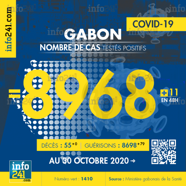Bilan épidémiologique du Gabon au 30 octobre 2020 : 11 nouveaux cas enregistrés en 48h dans l’Estuaire (6 cas) et l’Ogooué-Maritime (5 cas). Il y a eu aucun nouveau décès et 79 nouvelles guérisons.
