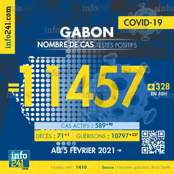 Bilan épidémiologique du Gabon au 5 février 2021 : 328 nouveaux cas enregistrés en 48h dans l’Estuaire (286 cas), l’Ogooué-Maritime (33 cas), le Haut-Ogooué (7 cas) et le Moyen-Ogooué (2 cas). Il y a eu 1 nouveau décès et 237 nouvelles guérisons.