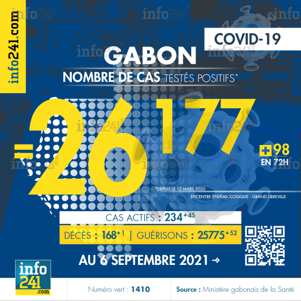 Ce qui porte le bilan à 26 177 cas confirmés, 168 décès et 25 775 guérisons. Le Gabon compte actuellement 234 (+45) cas actifs de la pandémie officiellement déclarés. Parmi eux 43 (+7) patients hospitalisés dans le pays dont 15 (-1) en réanimation.