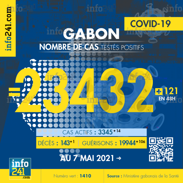 Ce qui porte le bilan à 23 432 cas confirmés, 143 décès et 19 944 guérisons. Le Gabon compte actuellement 3 345(+14) cas actifs de la pandémie officiellement déclarés. Parmi eux 48(-4) patients hospitalisés dans le pays dont 19(-3) en réanimation.