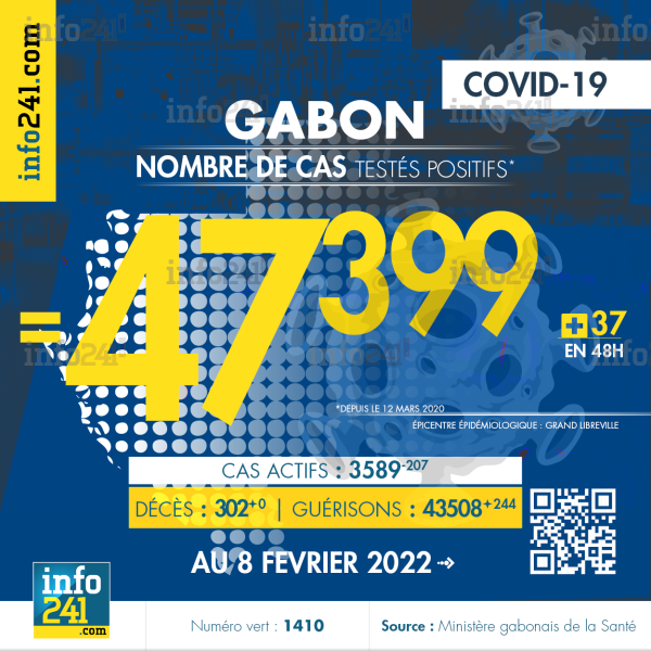 Bilan épidémiologique du Gabon au 8 février 2022 : 37 nouveaux cas enregistrés en 48h dans l’Estuaire (35 cas) et l’Ogooué-Maritime (2 cas). Il y a eu aucun nouveau décès et 244 nouvelles guérisons.