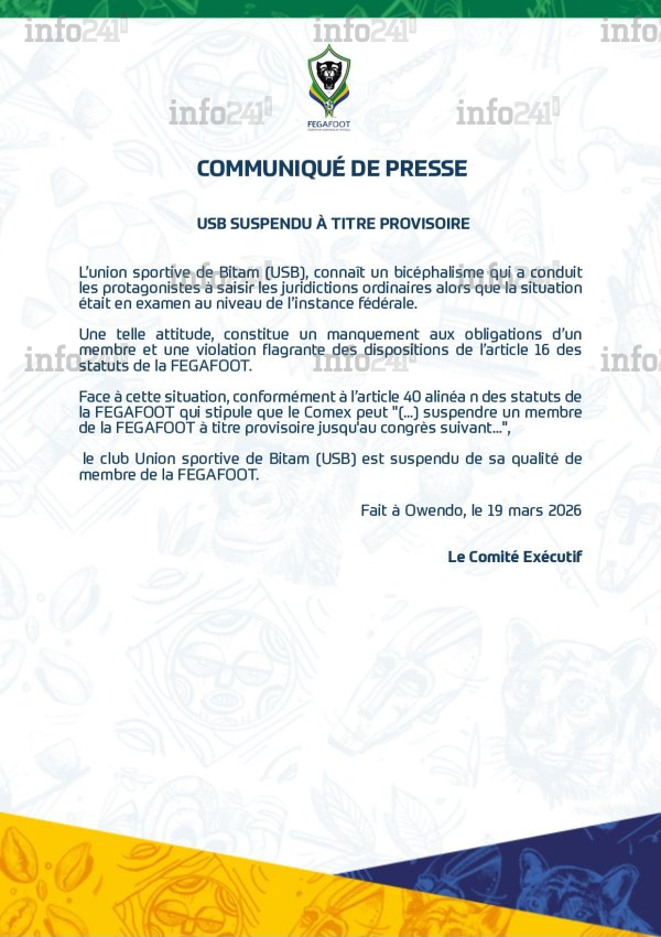 Face à cette obstination, la Fégafoot a tranché dans le vif, considérant cette attitude comme un manquement grave aux obligations d’un membre et une violation flagrante des dispositions de l’article 16 de ses statuts. S’appuyant rigoureusement sur l’article 40, le comité d’urgence a décidé de suspendre l’USB de sa qualité de membre à titre provisoire. Un couperet sévère qui restera effectif jusqu’à une éventuelle réintégration par le comité exécutif ou lors du prochain congrès ordinaire de l’institution.