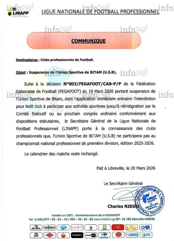 Crise à l’Union sportive de Bitam : la Linafp entérine l’exclusion du club du National-Foot 1 pour la saison © 2026 D.R./Info241