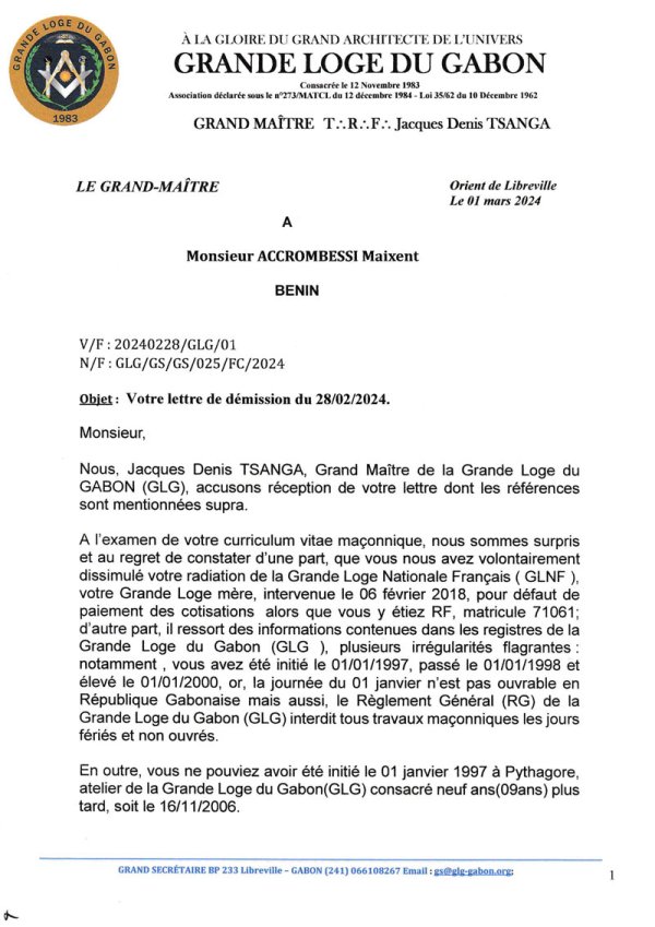 Le « Grand Maître » des francs-maçons du Gabon doute ainsi de son initiation « le 1er janvier 1997 à Pythagore, atelier de la Grande Loge du Gabon (GLG), consacré neuf ans (09 ans) plus tard, soit le 16 novembre 2006 ». Un passé trouble qui lui vaut « en lieu et place de votre démission nous transmise, par la présente, nous vous notifions plutôt, la cessation des privilèges, des droits de direction et de représentation dolosivement obtenus par vous de la GLG », conclut le courrier officiel parvenu à la rédaction d’Info241.