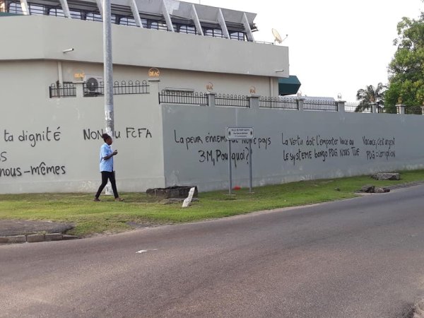 La défiance anti-Bongo est vivace dans la capitale économique du Gabon. A port-Gentil, des tags anti-Bongo ont été découverts sur la devanture du siège local de Banque des états de l’Afrique centrale. Parmi eux, Sylvia Bongo, la femme d’Ali Bongo, en prend particulièrement pour son grade. Comme en témoignent ces clichés pris ce vendredi. Un pied de nez à la famille Bongo et à la présidente de la Cour constitutionnelle, Marie Madeleine Mborantsuo, elle aussi épinglée.