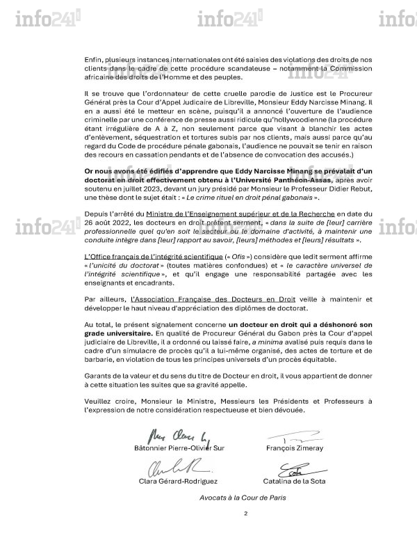 Doctorat d’Eddy Minang : quand le « signalement » des 4 avocats des Bongo expose leurs risibles lacunes © 2026 D.R./Info241