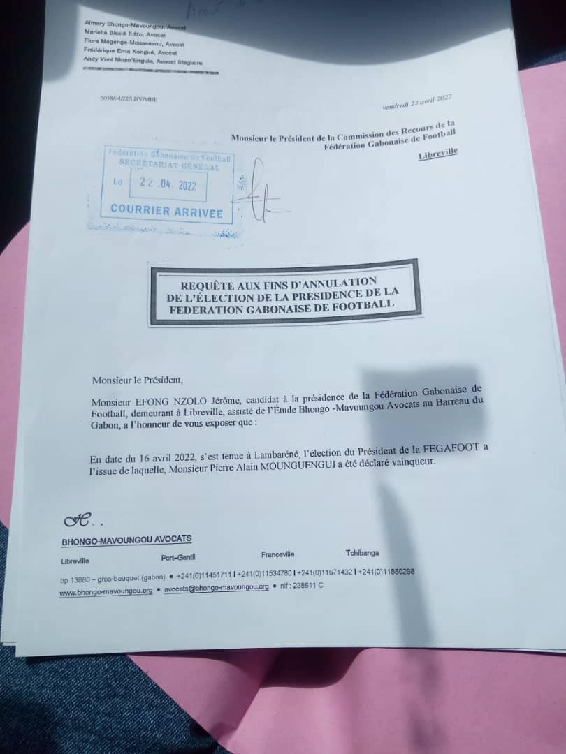 Evoquant clairement « de flagrantes irrégularités de nature à remettre en cause le résultat final », il a annoncé samedi avoir saisi veille, la commission des recours de la Fegafoot comme il s’était engagé au soir de sa seconde défaite contre Pierre-Alain Mounguengui. Une requête introduite donc ce 22 avril par l’intermédiaire du cabinet d’avocats Bhongo-Mavoungou. Une bataille qui s’ouvre alors que son rival est détenu depuis jeudi dans les locaux de la Direction générale des contre-ingérences et de la sécurité militaire (DGCISM) communément appelée B2.
