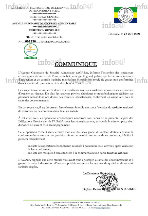 L’Agence gabonaise de sécurité alimentaire (Agasa) a annoncé ce mardi l’interdiction immédiate de la distribution et de la commercialisation de l’eau en sachet sur tout le territoire national. Cette décision fait suite à des inspections ayant révélé de graves manquements sanitaires dans plusieurs unités de production, où l’eau provenait de sources non contrôlées et était conditionnée dans des conditions d’hygiène jugées alarmantes.