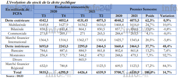 Cette nouvelle hausse est la résultante de l’accroissement de la dette intérieure qui est passée de 2243,5 milliards (fin 2020) à 2 465,5 milliards soit une hausse 222 milliards de FCFA contractés par l’Etat auprès des banques. A fin juin 2021, la structure du portefeuille de la dette publique est composée 62,3% de la dette extérieure et de 37,7% de la dette intérieure, souligne la DGEPF.