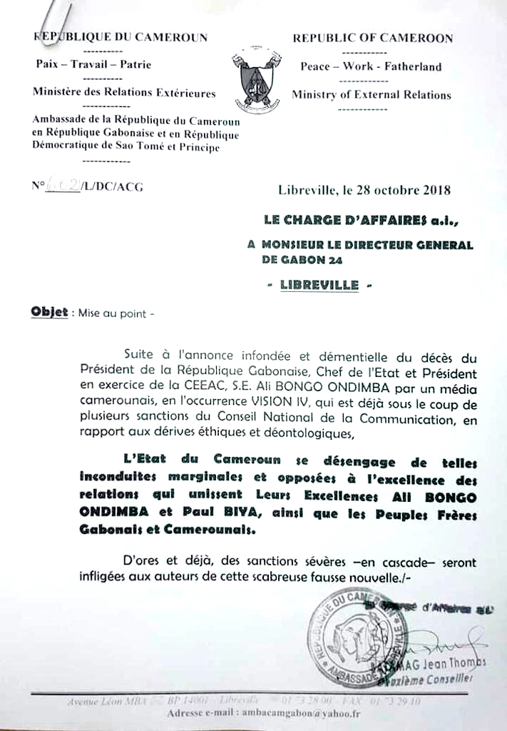Quand les ennuis de santé d’Ali Bongo virent à l’incident diplomatique. Pour avoir annoncé hier soir la « mort » d’Ali Bongo sur ses antennes, l’Etat camerounais promet à nos confrères camerounais de la télévision privée Vision 4 des « sanctions sévères en cascade ». C’est ce qu’indique une lettre de la chancellerie camerounaise adressée au directeur général de Gabon24, la chaîne info du groupe Gabon télévision.