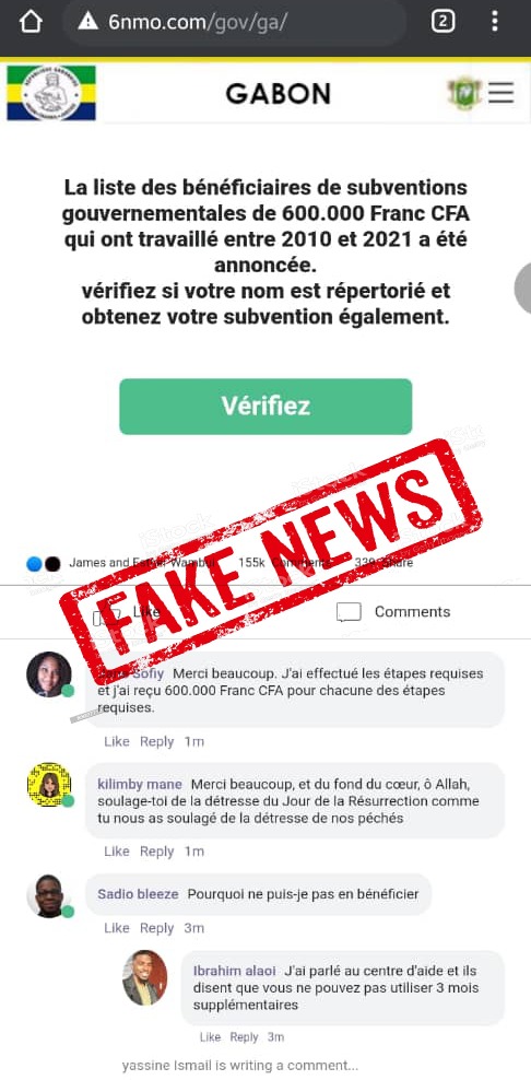 « 🇬🇦 La liste des bénéficiaires de subventions gouvernementales de 600.000 Franc CFA qui ont travaillé entre 2010 et 2021 a été annoncée. Chaque bénéficiaire recevra 200.000 Franc CFA par mois pendant 3 mois. Vérifiez si vous êtes admissible.👇 », telle est la nature du message présent depuis mardi notamment sur la messagerie WhatsApp. Une « fake news » démentie mercredi par le gouvernement gabonais.
