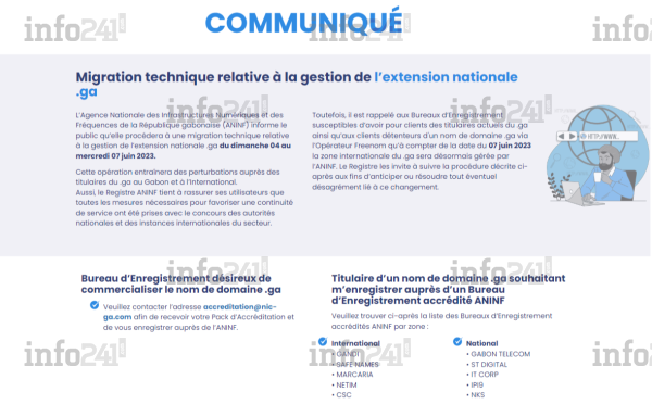 Depuis plusieurs jours les noms de domaine en .ga souffrent de la migration annoncée de leur gestion de reprise par l’Aninf pour la transférer finalement à l’Association française pour le nommage Internet en coopération (Afnic), une agence qui gère les noms de domaine français. Un choix curieux pour notre agence nationale qui visiblement malgré les années accumulées, ne détient toujours pas l’expertise nécessaire pour gérer en autonomie elle-même ce domaine de souveraineté.