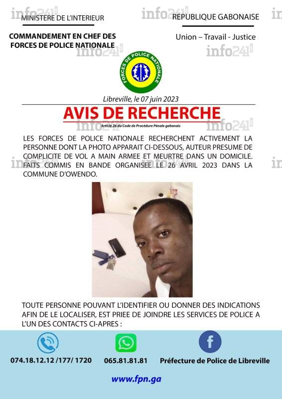 Le principal suspect est un homme âgé de 30 ans. Il est depuis hier activement recherché par la police pour faire toute la lumière sur ce meurtre. « Pour les nécessités d’enquête, les Forces de police nationale recherchent activement la personne dont la photo apparait ci-dessous, auteur présumé de complicité de vol à main armée et meurtre dans un domicile. Faits commis en bande organisée le 26 avril dernier dans la commune d’Owendo », indique la police.
