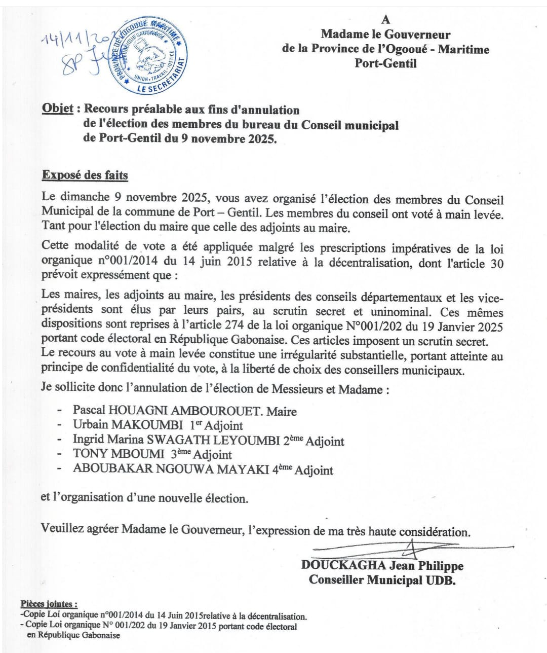 Au cœur de la contestation se trouve Jean-Philippe Douckagha, conseiller municipal de l’Union démocratique des bâtisseurs (UDB), formation politique dont pourtant est issue le nouveau maire. Dans un recours daté de ce vendredi 14 novembre et adressé au gouverneur de l’Ogooué-Maritime, il dénonce une « violation flagrante » de la loi. Selon lui, le vote à main levée utilisé pour la désignation de Pascal Houangni Ambourouet, désormais proclamé maire, et de ses adjoints, est contraire aux exigences légales relatives à la confidentialité et à la liberté du vote.
