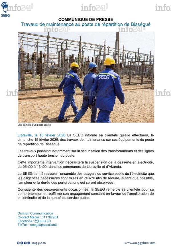 Le dimanche à venir sera bien particulier pour les habitants de la capitale gabonaise et ses environs déjà frappés par des délestages chroniques. Selon un communiqué parvenu à la rédaction d’Info241 ce vendredi, la Société d’énergie et d’eau du Gabon (SEEG) informe sa clientèle que des travaux de maintenance seront effectués ce dimanche 15 février sur les équipements du poste de répartition de Bisségué. Cette intervention vise spécifiquement la sécurisation des transformateurs et des lignes de transport haute tension.