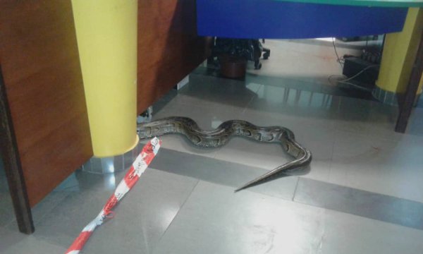 Grosse frayeur ce mercredi matin pour les salariés du siège social de la Caisse nationale de sécurité sociale (CNSS) du Gabon. Un python de plusieurs mètres a été retrouvé par des vigiles dans le hall de l’entreprise publique située à Libreville. Rapidement mis hors d’état de nuire, comme le montré ces clichés, le nuisible a tout de même plongé les employés et les riverains dans la stupeur. Que faisait-il là ? Y était-il depuis des lustres ? That is the question !