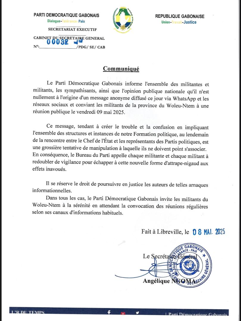 Cette démission collective a commencé en catimini le 7 mai, avec la diffusion d’un communiqué appelant les ressortissants du Woleu-Ntem à une réunion ce vendredi à Libreville. Le document portait les noms de Guy Patrick Obiang Ndong et Charles Mve Ella. Tollé au sein du PDG. Le lendemain, le Secrétariat exécutif du parti publiait un démenti cinglant signé d’Angélique Ngoma, dénonçant une « tentative grossière de manipulation » et menaçant même de poursuites judiciaires contre les auteurs de « cette nouvelle forme d’arnaque informationnelle ».