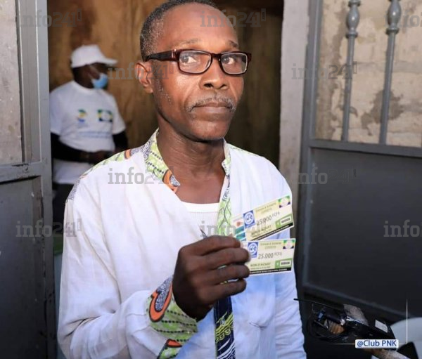 Un bénéficiaire posant avec ses bons d’achats du réseau CECAGADIS