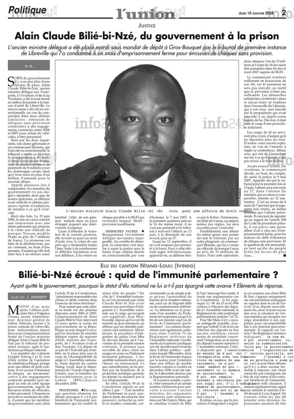 Puis survient ses déboires judicaires. 12 jours seulement après sa sortie du gouvernement, Alain-Claude Bilie-By-Nzé sera jeté le 8 janvier 2008 à la prison centrale de Libreville pour émission de chèques sans provision pendant qu’il était au gouvernement. Ce, malgré son statut de député du canton Ntang-Louli (Makokou). Sa condamnation à un mois de prison ferme, n’empêchera pas l’ancien prisonnier de connaitre 4 longues années de passage à vide après lesquelles il sera remarqué par Ali Bongo.