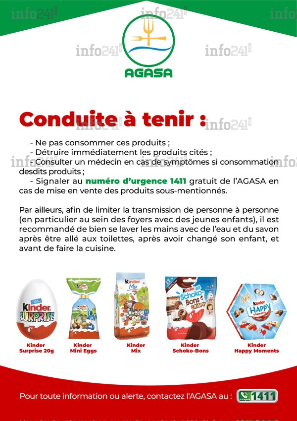 « Faisant suite au retrait-rappel de certains produits de la marque Kinder par l’entreprise Ferrero, en raison d’une suspicion de contamination à Salmonella Typhimurium, l’Agence Gabonaise de Sécurité Alimentaire (AGASA) ordonne, en l’absence de numéros de lots clairement identifiés et par principe de précaution, le retrait desdits produits des surfaces de vente », note le communiqué daté du 5 avril.