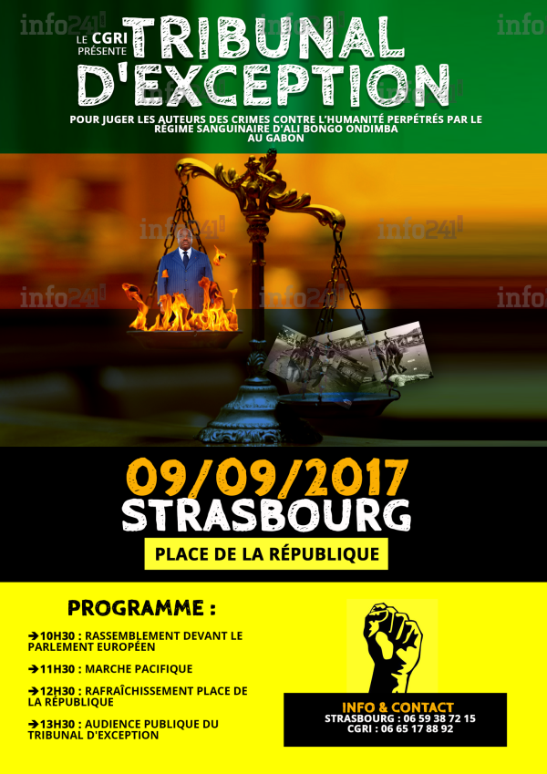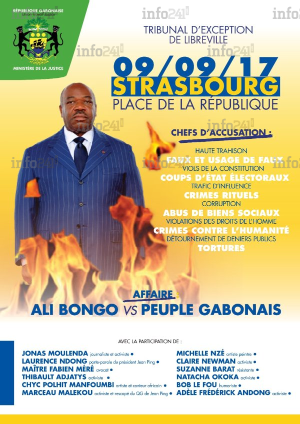 La diaspora gabonaise mettra ce samedi sur le grill Ali Bongo et ses sbires face à leurs crimes et autres exactions. C’est ce qu’indique un communiqué de presse parvenu ce mercredi à la rédaction d’Info241. Ali Bongo et son régime y répondront de nombreux chefs d’accusation comme ceux de crimes contre l’humanité, tortures, haute trahison et faux et usage de faux. Un tribunal d’exception donc qui débutera après une marche qui prendra son départ au Parlement européen de Strasbourg.