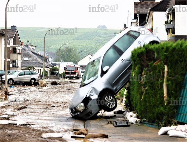 Des crues soudaines ont frappé certaines parties de la Rhénanie-Palatinat (ouest) et de la Rhénanie du Nord-Westphalie (nord-ouest), les deux États allemands les plus peuplés, transformant les rues en rivières et causant l’effondrement d’un certain nombre de maisons.