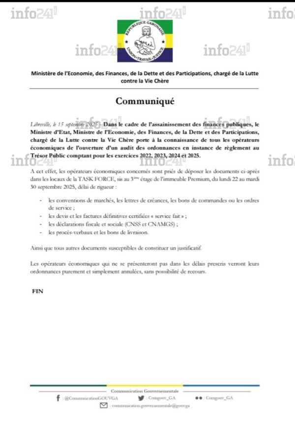 Le ministère de l’Économie, des Finances, de la Dette et des Participations, chargé de la lutte contre la vie chère, a apporté ce mardi 23 septembre des précisions sur son opération d’assainissement des créances de l’État. Par un communiqué lu à la télévision publique par le secrétaire général, Guy Nazair Samba, le ministre d’État Henri-Claude Oyima a invité l’ensemble des opérateurs économiques à déposer leurs dossiers de créances au plus tard le 30 septembre 2025.