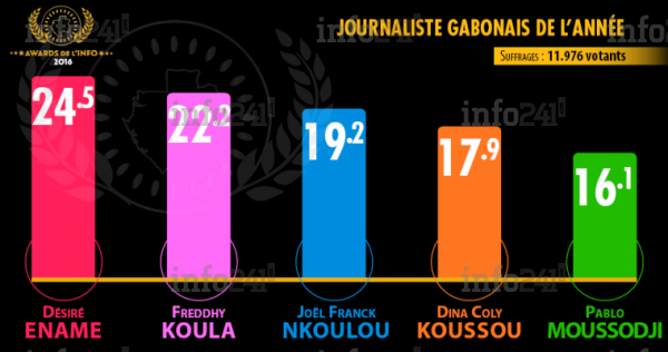 Désiré Ename (Echos du Nord) a été sacré par le vote des internautes gabonais, prix du Journaliste gabonais de l’année 2016. Le lauréat a été préféré à 4 autres personnalités que sont : Freddhy Koula, 22,20% (Gabon24), Joël Franck Nkoulou, 19,20 % (TV+), Dina Koussou, 17.90 % (Kanal 7) et de Pablo Moussodji Ngoma 16.10 % (Gabon télévision).