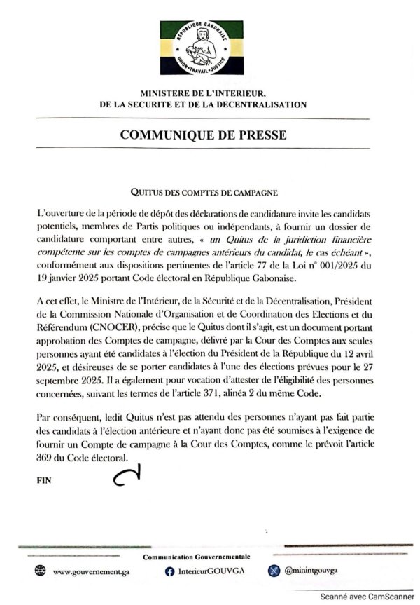 Le document va plus loin en soulignant que le quitus de la Cour des comptes est exigé exclusivement des candidats ayant pris part à un scrutin où celui-ci était déjà exigible, à l’instar de l’élection présidentielle du 12 avril 2025, et souhaitant se représenter à une autre élection. Il atteste de l’approbation formelle de leurs comptes de campagne par la Cour des comptes, conformément à l’article 371, alinéa 2 du Code électoral. Or, l’ancien député sortant du siège unique du 2ᵉ arrondissement de Makokou et du canton Ntang-louli s’y refuse.