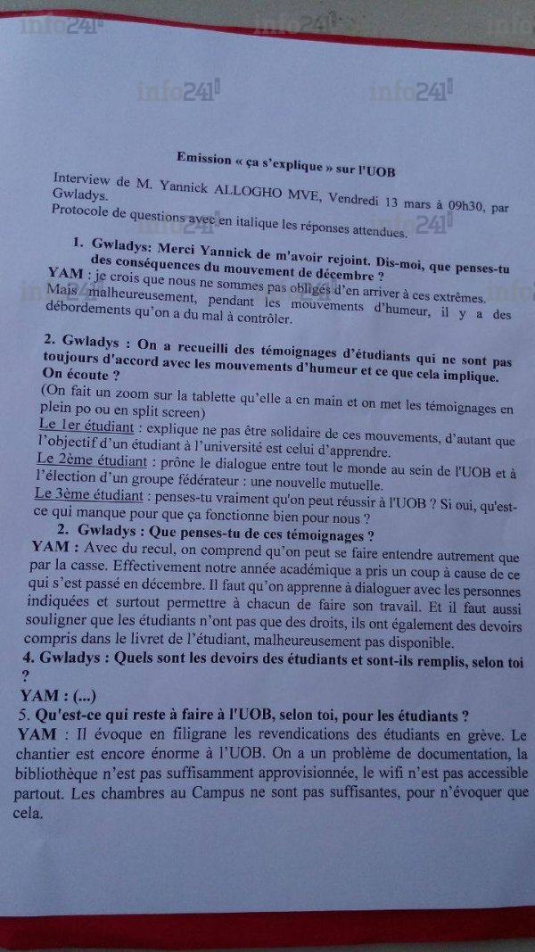 Une démarche non conforme à la déontologie et à l’éthique professionnelles. En effet, le journaliste est autorisé à envoyer à son futur interviewé le questionnaire et non les questions. Cette démarche relève de la corruption morale. Il s’agit d’une faute professionnelle grave. A moins que l’émission se soit transformée en télé-réalité société où chaque invité serait tenu à un rôle bien précis pour parler des difficultés de la crise estudiantine qui émaille de l’Université Omar Bongo.